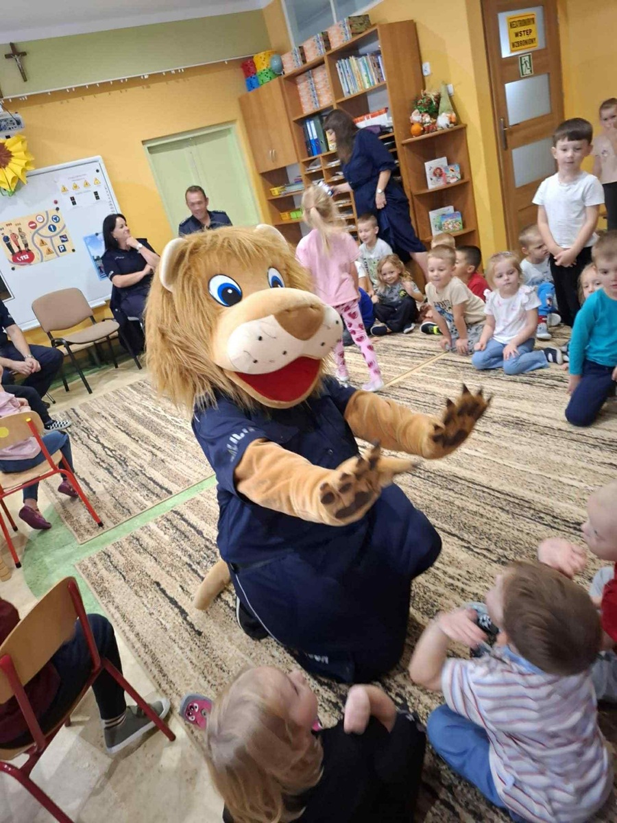 Przedszkolaki miały do policjantów dużo ciekawych pytań i dzieliły się trafnymi spostrzeżeniami. Dużo radości wśród dzieci wywołała wizyta maskotki policyjnej sierżanta Lwa. Dzieci chętnie się z nim witały i robiły sobie pamiątkowe zdjęcia.