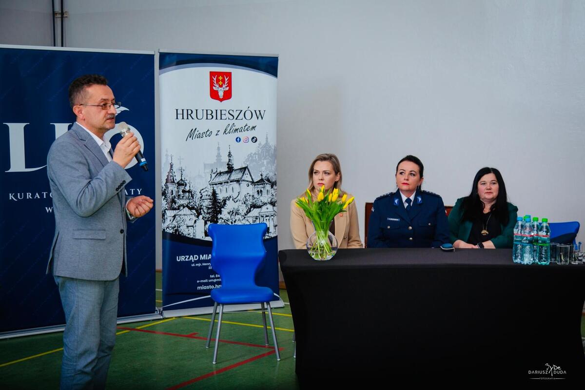 Spotkanie rozpoczęło się od zaprezentowania założeń kampanii przez organizatorów i partnerów. Dyrektor Kuratorium Oświaty w Lublinie Delegatura w Zamościu Pani Katarzyna Wołoszyn przywitała gości oraz opowiedziała o genezie wydarzenia, którym było zdarzenie drogowe, do którego doszło w Zamościu 1 grudnia 2025 roku. Na przejściu dla pieszych kierujący Hondą potrącił 74-latka. Kierowca odjechał z miejsca zdarzenia nie udzielając pomocy pieszemu. Poszkodowany kilka minut leżał na jezdni i nikt nie zareagował, nie udzielił mu pomocy, nikt nie zadzwonił też na numer alarmowy. Niestety 74-latek w wyniku odniesionych obrażeń zmarł w szpitalu. Następnie głos zabrała aspirant sztabowy Edyta Krystkowiak Oficer Prasowy Komendy Powiatowej Policji w Hrubieszowie przedstawiając rolę hrubieszowskiej Policji w kampanii. Zaprezentowała przygotowany na potrzeby kampanii film edukacyjny oraz prezentację. Rolą policjantów w kampanii będzie również prowadzenie zajęć w szkołach na terenie powiatu hrubieszowskiego.